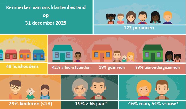 Onze klanten komen uit gezinnen of leven als alleenstaande. De verdeling over alleenstaanden, gezinnen en eenoudergezinnen was in 2025 ongeveer gelijk aan die van 2024. Met in 2025 een relatieve toename van alleenstaanden en mannen. En een afname van gezinnen, kinderen en vrouwen (zie afbeelding).
